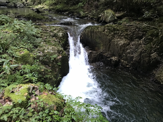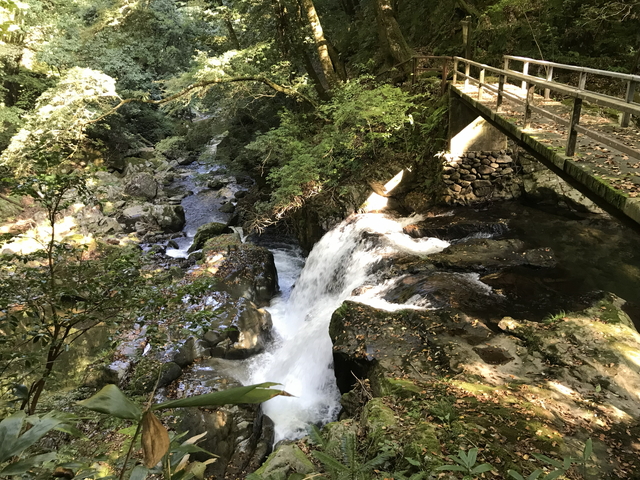 手前が八塩滝(二の滝)、奥が八汐滝(一の滝)です。両方とも「やしおだき」と読むみたいです。 八塩滝の左手に鉄鎖があり、登れるようになっていますが、3連休初日なので無理はしないでおきました。全体として三重県の赤目四十八滝のスケールを小振りにした感じです。 |