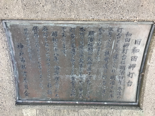 昭和38年(西暦1963年)に海岸埋立のために廃灯となり、昭和39年(西暦1964年)に和田岬から【須磨海浜公園】に移設保存されています。 平成10年(西暦1998年)に国の登録有形文化財【旧和田岬灯台】に登録されました。 |