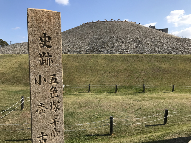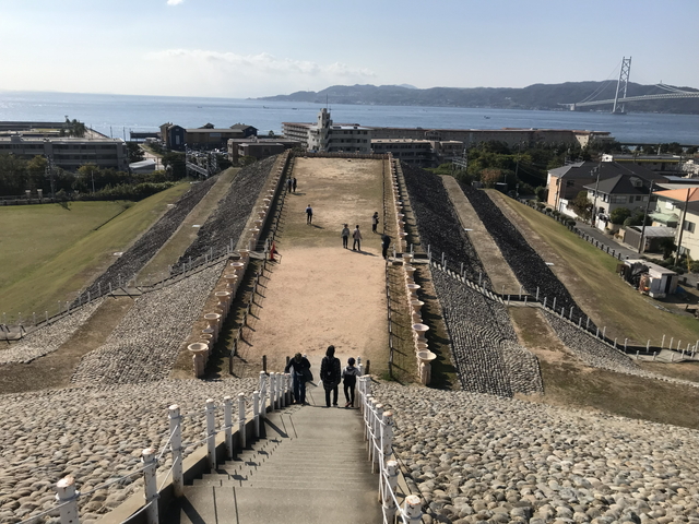 五色塚古墳は、前方後円墳の形状をしており、古墳の上を歩けるようになっています。 日本で最初に復元整備が行われた古墳として知られており、兵庫県で最大規模の古墳でとされています。 円墳から明石海峡、明石海峡大橋が見渡せて上々のロケーションですが、南側にあるため、逆光にはなってしまいます。西側にある小壺古墳と一緒に国の史跡に指定されています。 |