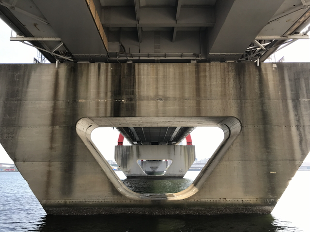 真下からの写真です。 六甲大橋は、昭和52年(西暦1977年)に供用開始した橋長400mのダブルデッキ連続トラス式斜張橋となります。完成当時、世界初とニュースになりました。 |