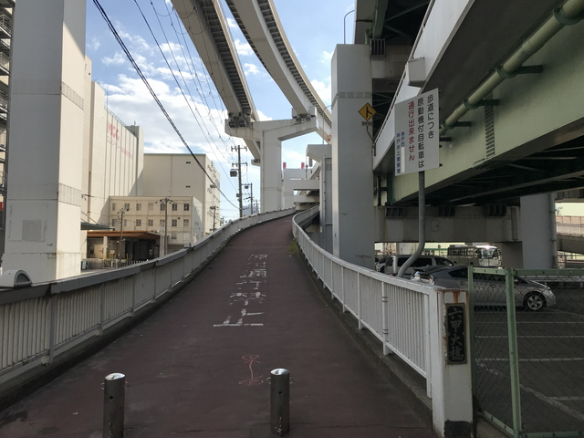 ダブルデッキとは、2つのデッキが同じ橋桁に配置され、上下2方向に交通が分流できる構造を指しており、上段が北行き車道と六甲ライナー(神戸新交通六甲アイランド線)が、下段が南行き車道と歩道が通っています。 こちらがその歩道の入口です。原付はNGだけど、純粋な自転車はOKとなっています。 |