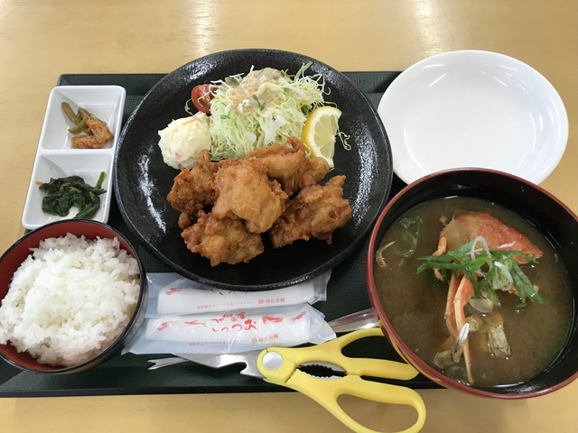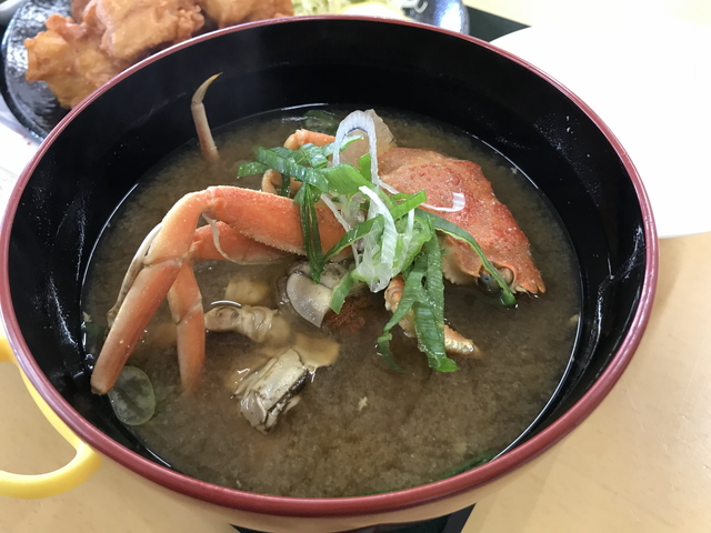 鳥取砂丘の道路を挟んだ場所にある立地なので観光地価格でちょっと割高ですが、からあげ定食1,500円に+400円で、かに汁を頂きます。 かに汁に入っているカニさんのためにハサミとほじくる奴が付いてきます。食べるところは殆どありませんが。 |