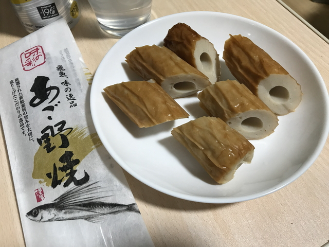 砂丘会館でお土産に購入した農山漁村の郷土料理百選【あごのやき】です。 味は、何と言いますか、見た目の通り「ちくわ」でございます。ご馳走様です。 |