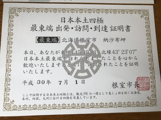 4つの市町が連携した証明書で、4枚集めると日本本土四極踏破証明書が完成するタイプです。 良いですね。集めちゃおう! |