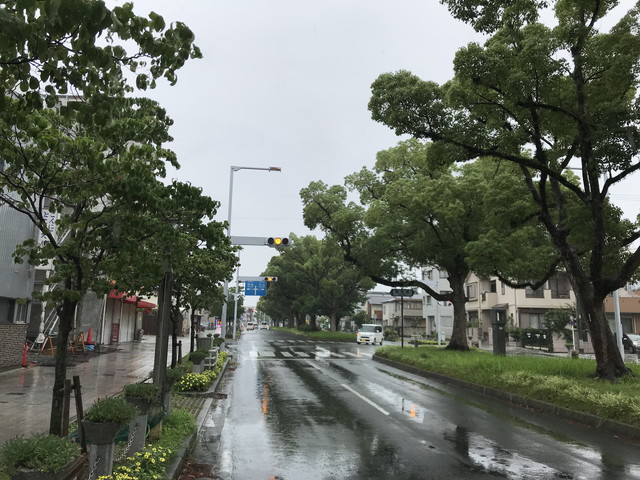 豊橋市役所から南に伸びる大通り沿いに街路樹が並んでいました。コンスタントに信号が連なっているのが印象的でした。 |