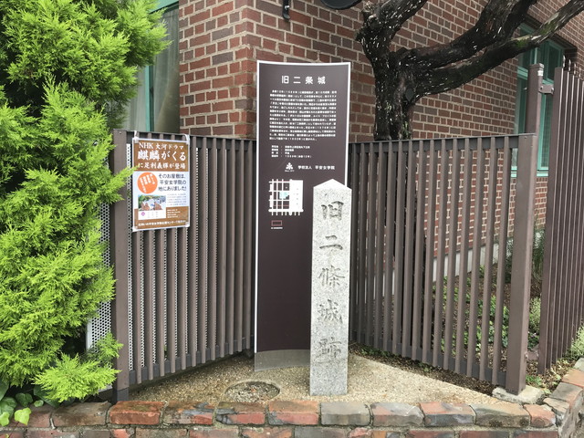 メダルをゲット出来ず傷心のまま城跡めぐりです。 こちらは二条御所跡地です。今ある二条城とは違って、「本能寺の変」が勃発した際に織田信長の息子・信忠が籠城し、明智軍に囲まれ自刃した場所です。歴史のターニングポイントになった場所です。 もし信忠が自刃せずに生き長らえていたら…秀吉も家康も織田家に従っていたかもしれない歴史のIFを想像させてくれます。 |