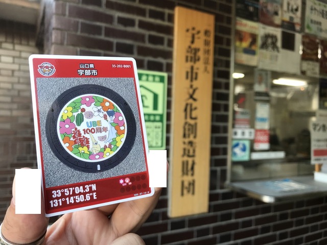 宇部市文化会館1階管理事務所を訪ねて、宇部市Bのマンホールカードを頂きます。 |