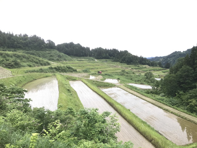蓮野(はすの)の棚田は、新潟県上越市大島区菖蒲にある棚田です。 山の斜面に約80枚の水田が段々に並んでいます。 |