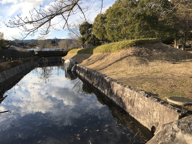 江戸時代に松岡城と改称されて、現在の高萩市立松岡小学校があるエリアが整備されたと現地案内板。土塁と水堀があります。 |